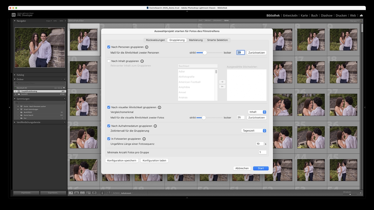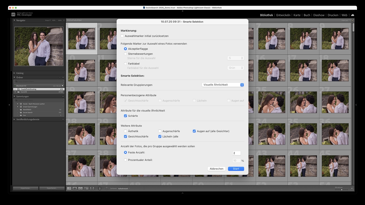 Wer Hochzeiten, Events oder Reportagen fotografiert, kennt das Problem: Hunderte oder tausende Bilder müssen gesichtet und sortiert werden. Die Auswahlprojekte nehmen Euch einen Großteil dieser Arbeit ab. Fotos werden automatisch in Gruppen sortiert, etwa nach Personen, visueller Ähnlichkeit, Aufnahmedatum, Serien oder Stichwörtern. Zusätzlich könnt Ihr nach Kriterien wie Schärfe, Ästhetik, Augenschärfe, Lächeln oder offenen Augen filtern. Unscharfe, falsch belichtete oder unvorteilhafte Aufnahmen erkennt die KI sofort. Wenn es einmal besonders schnell gehen soll, übernimmt Excire sogar die komplette Vorauswahl, die Ihr jederzeit manuell anpassen könnt.